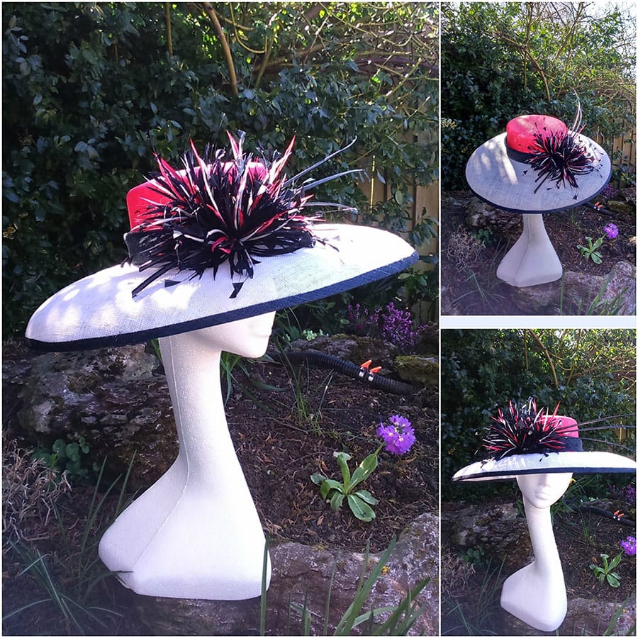 Striking, dramatic Audrey Hepburn style hat. A large ivory brim and cerise crown are encased with contrasting navy bias trims. A starburst of navy blue feather flowers injected with contrasting ivory and cerise goose biot. Double ostrich quills add to this simple but striking headpiece.