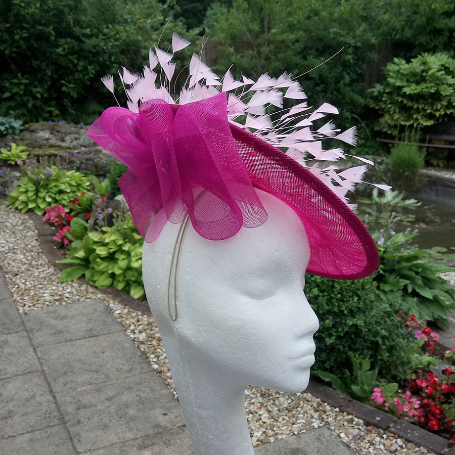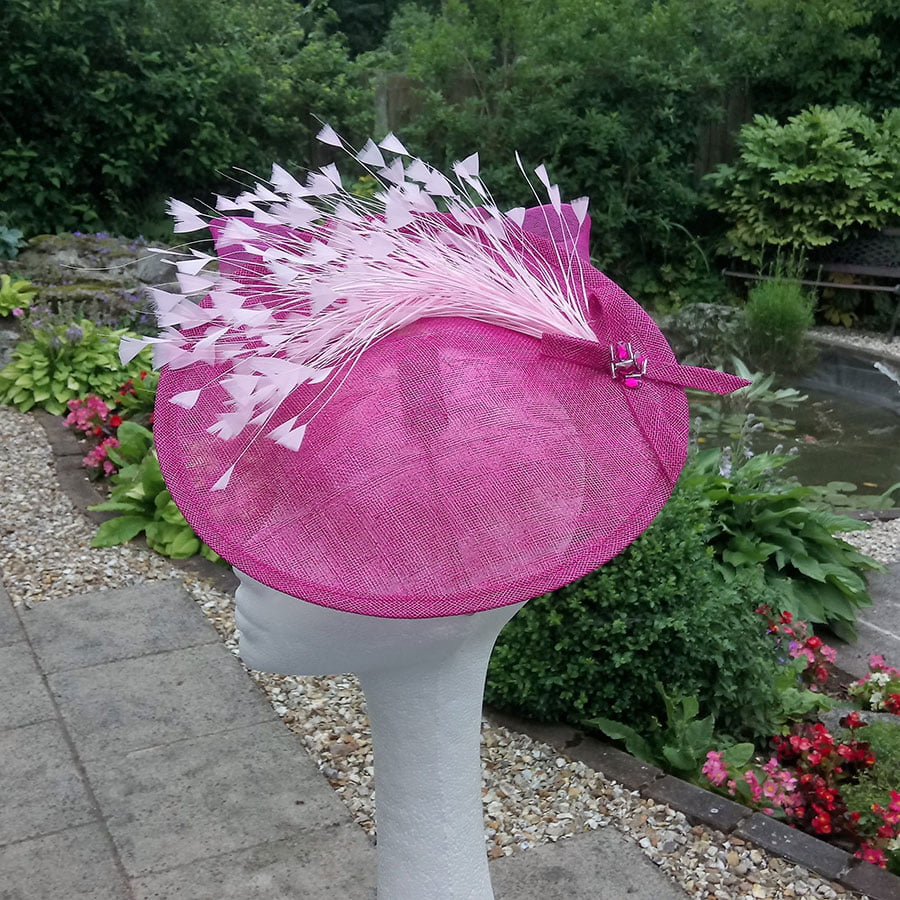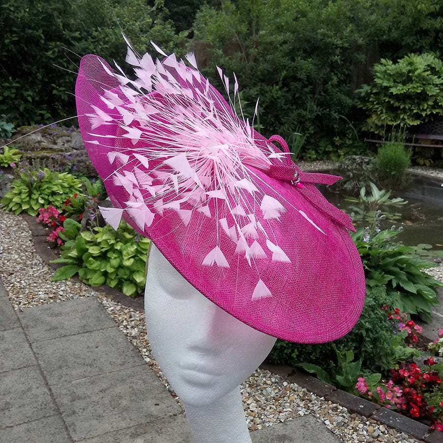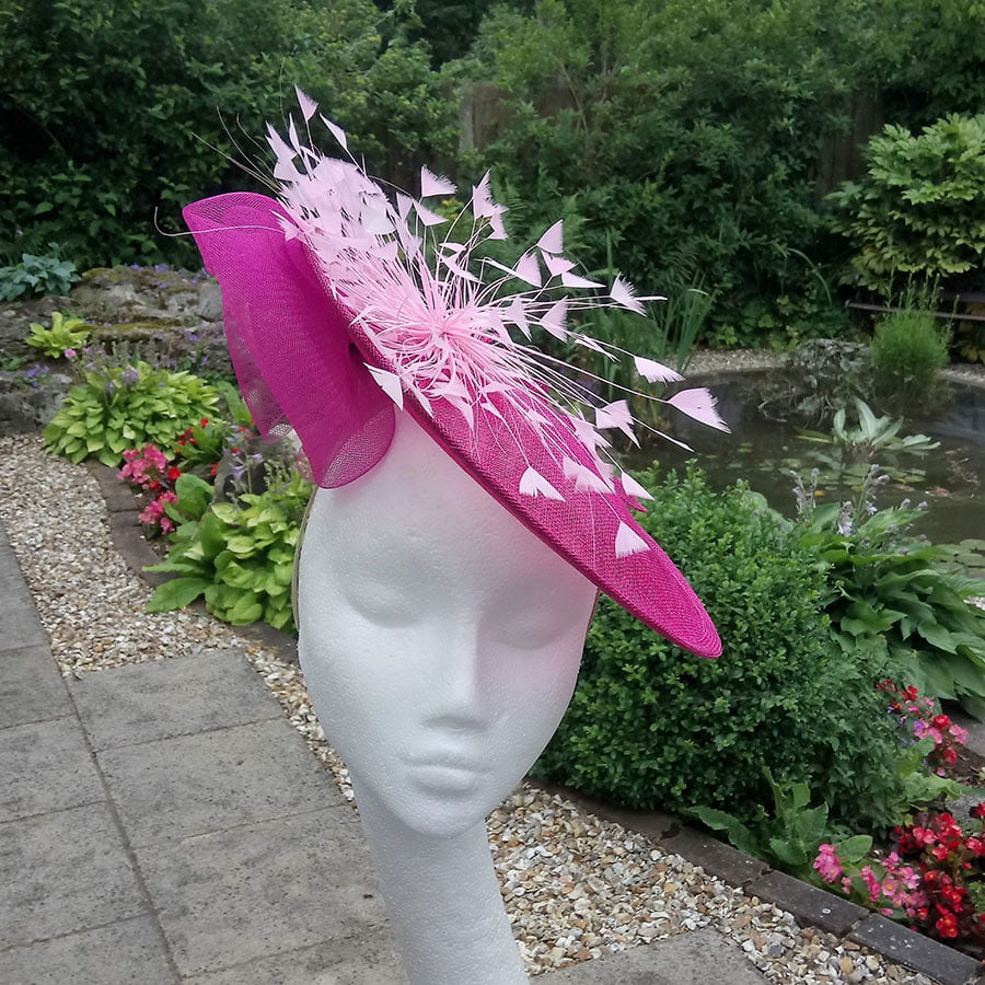 An array of hand rolled, hand dyed shaded petals, with a burst of pearls creating movement. Coq feathers give a softness to the piece.