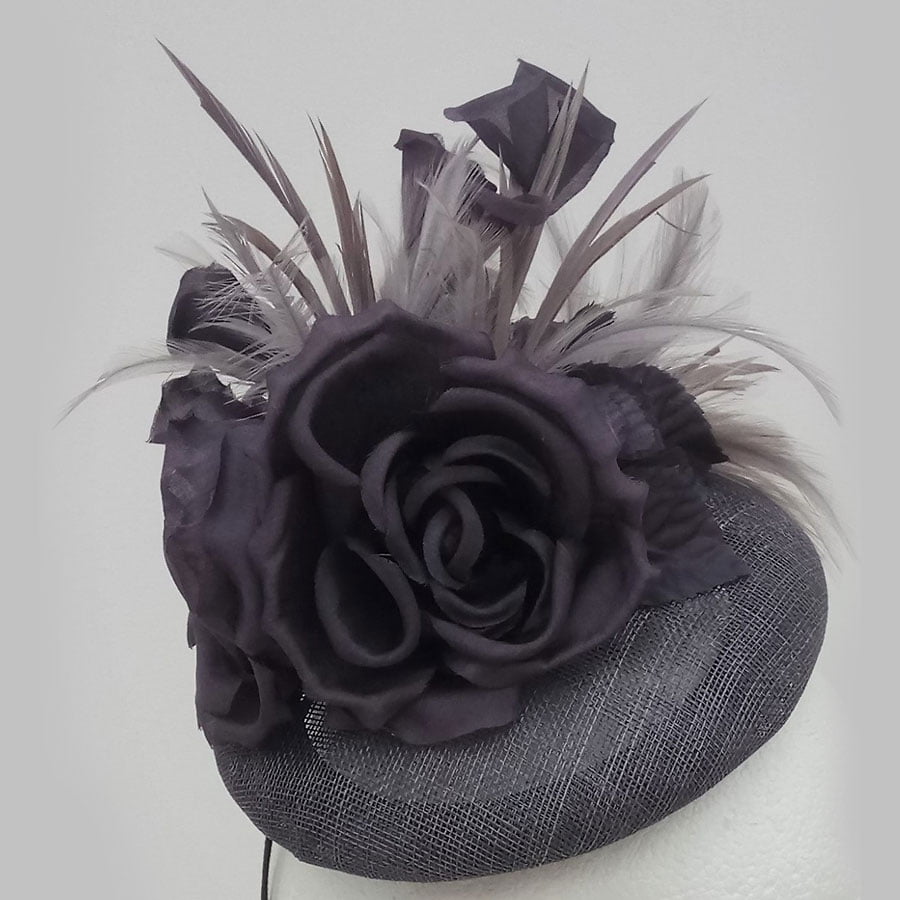 Button fascinator in charcoal grey sinamay. Embellished with a rose cluster, whilst pale charcoal hackle feathers and goose biot create added interest to this elegant piece. Sits on a headband.