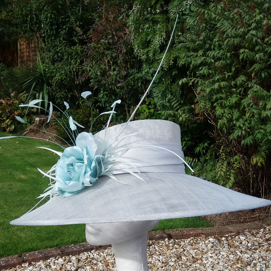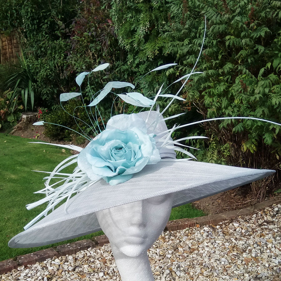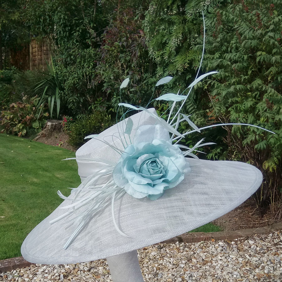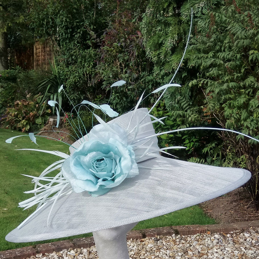 Delicate pale aqua hatinator – A crisp angled brim is complemented with a sharp angled low cut crown. A simple satin aqua band adds elegance, whilst a single aqua rose adorned with goose biot and coq feathers for soft movement add grace to this glamarous hatinator. Double ostrich quills create a sweeping drama for a dramatic effect.