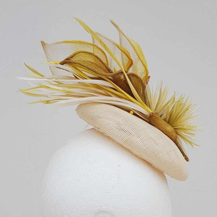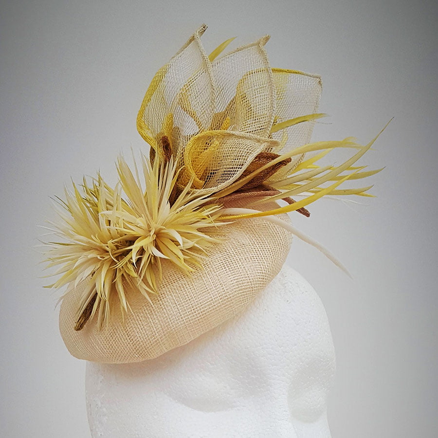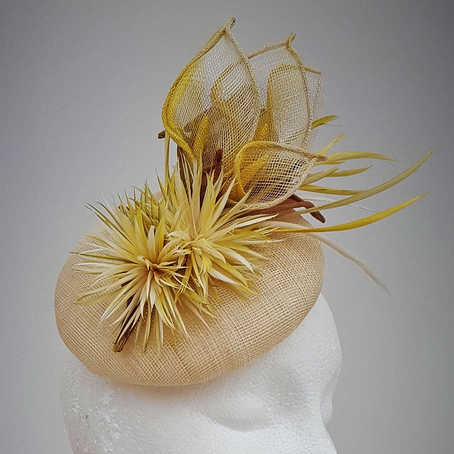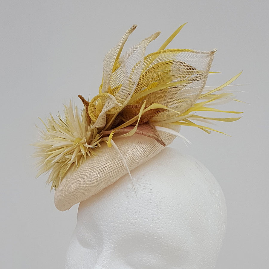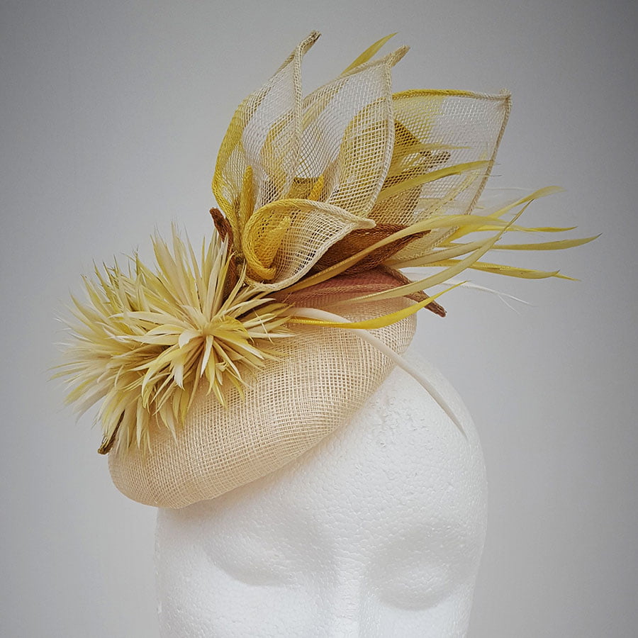 Stunning hand dyed sinamay headpiece adorned with hand made calla lillies encased in hand dyed goose biot . Soft colours create a feminine, romantic appearance