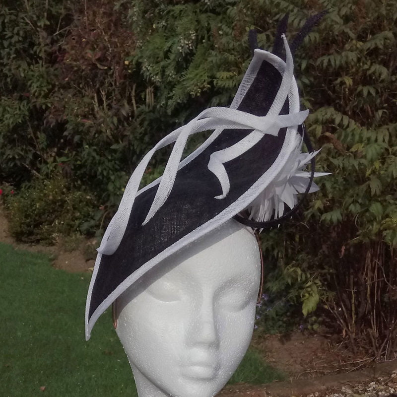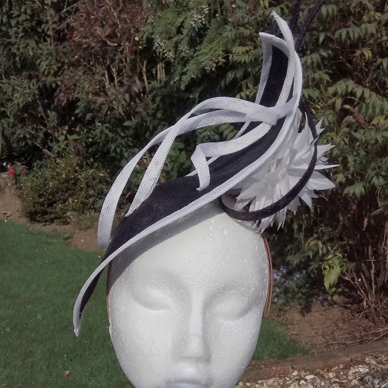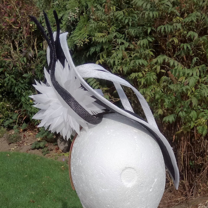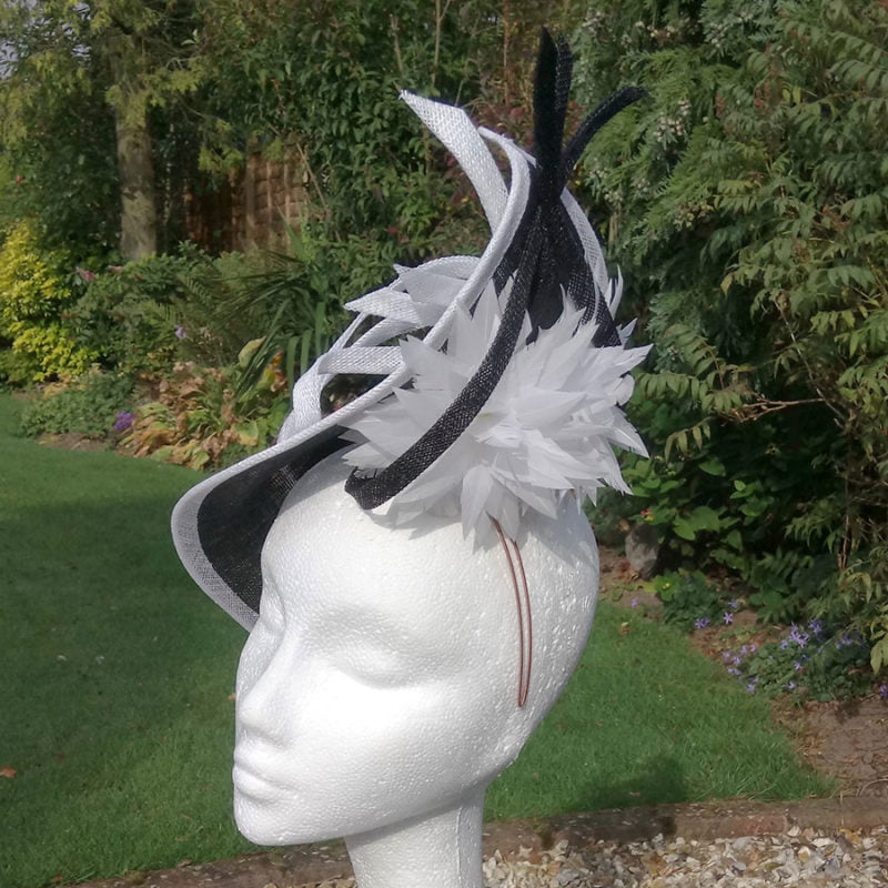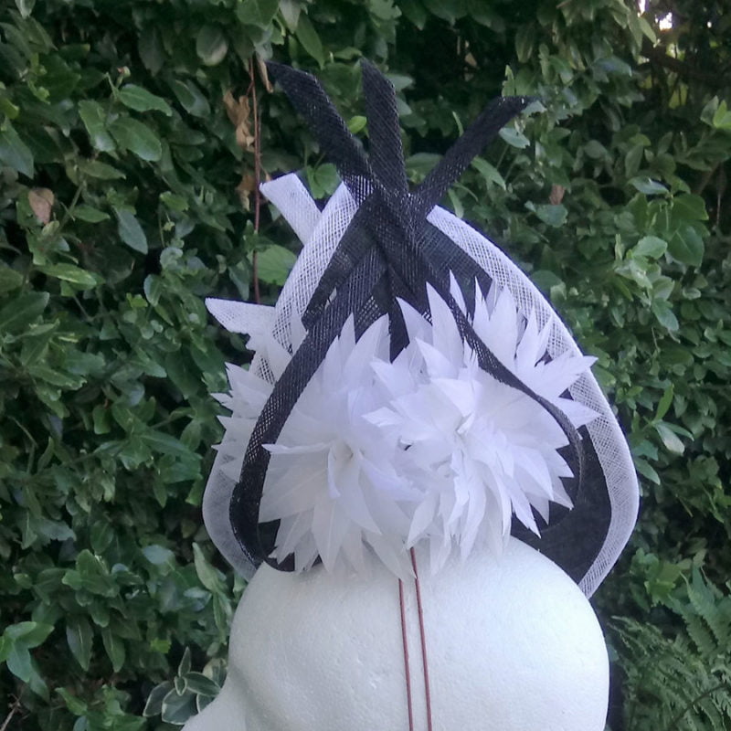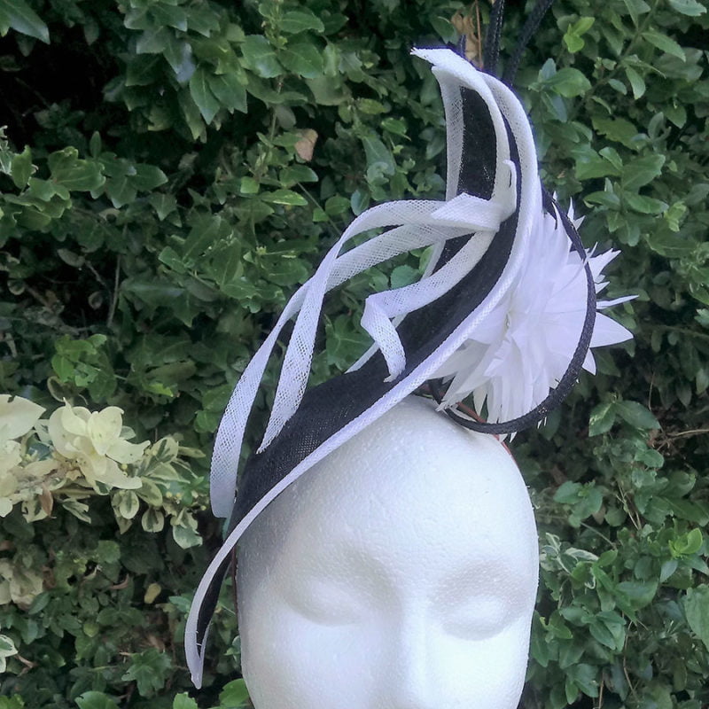 Gorgeous oversized petal in black and white sinamay which gently curves and sweeps whilst white curls cascade over the front. The underside is adorned with double feather flowers in a soft white with gently curved black sinamay curls. Sits on a headband.