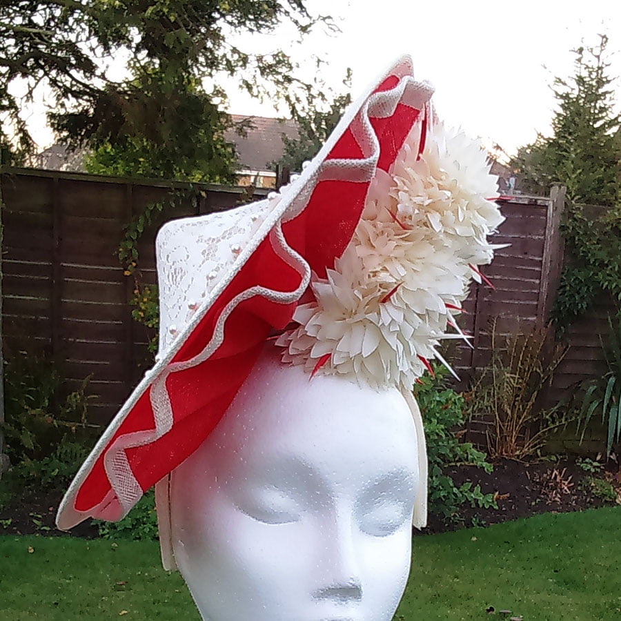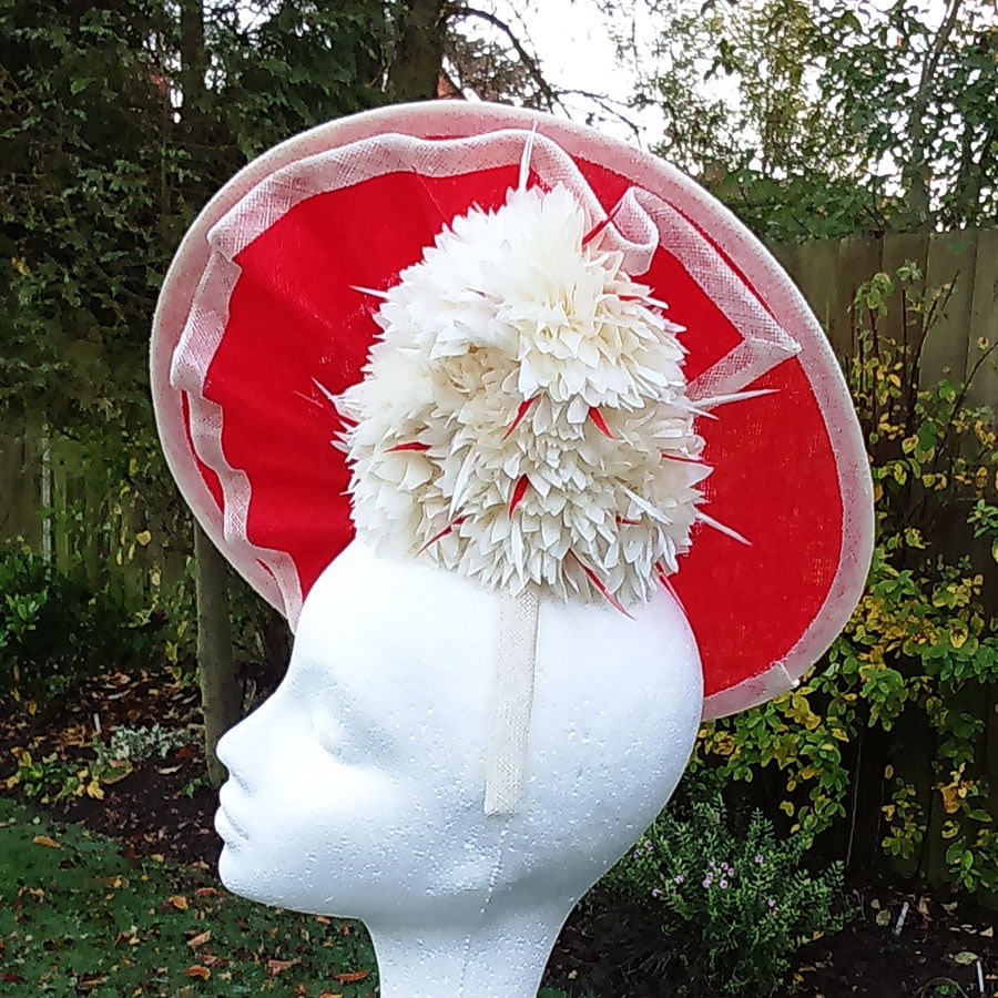 Fascinator on sinamay disc with centre dome. Hand manipulated mixed tone, sinamay scrolls formed into a lily inserted with soft hackle feathers and faux diamonds. Stripped coq feathers and a sinamay elongated scroll for a little piece of drama.