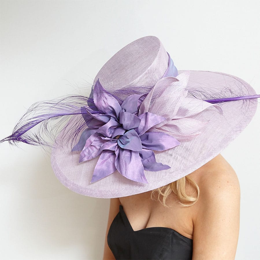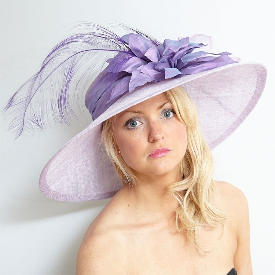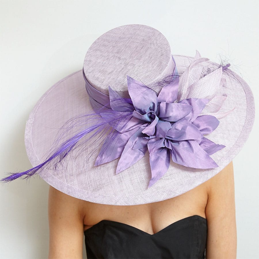 Dramatic statement hat. Matching sinamay petals complementing hand made silk lily flower. Finished off with burnt ostrich feather.