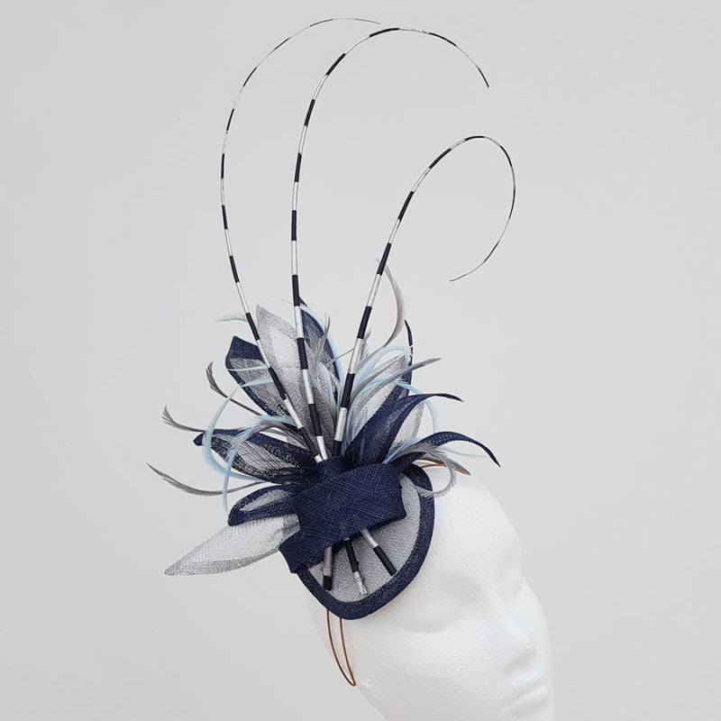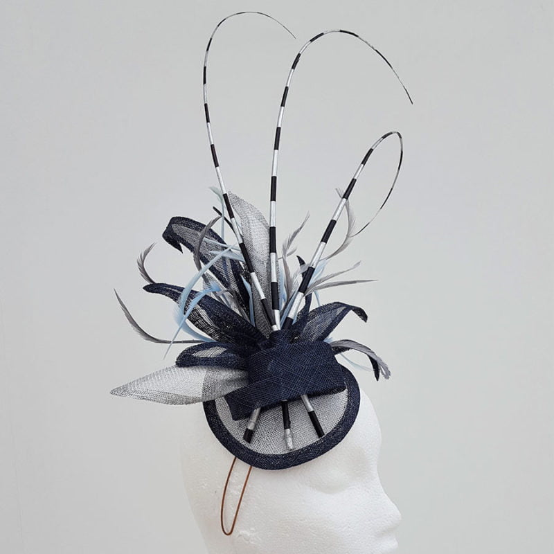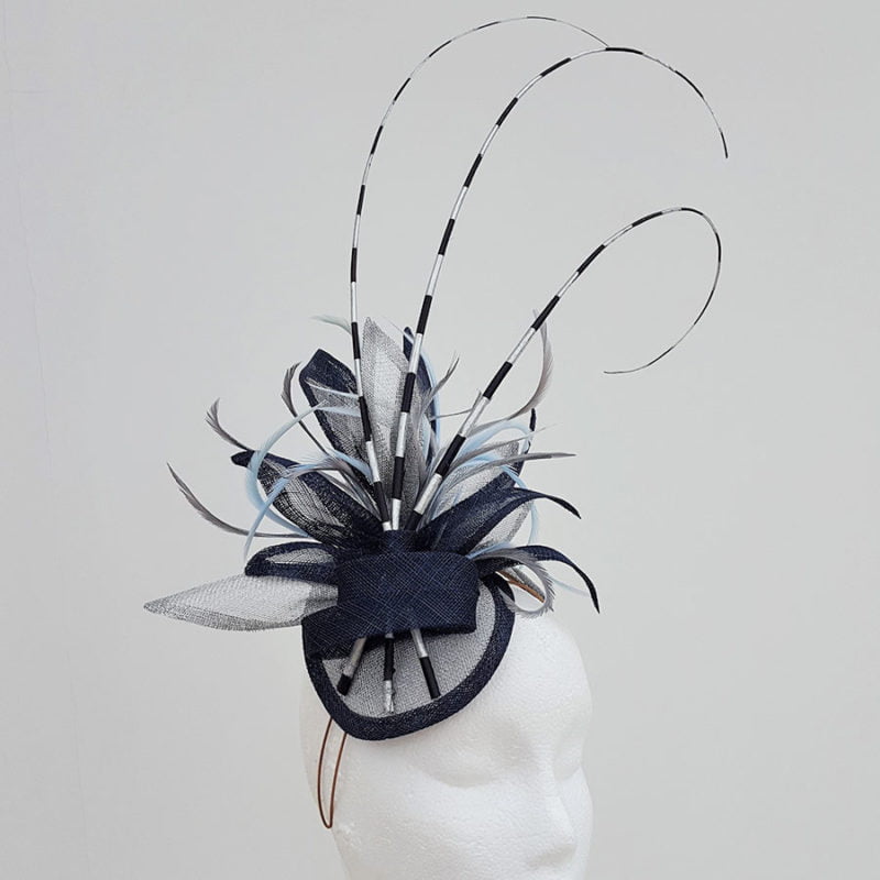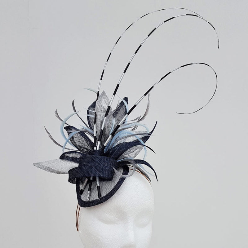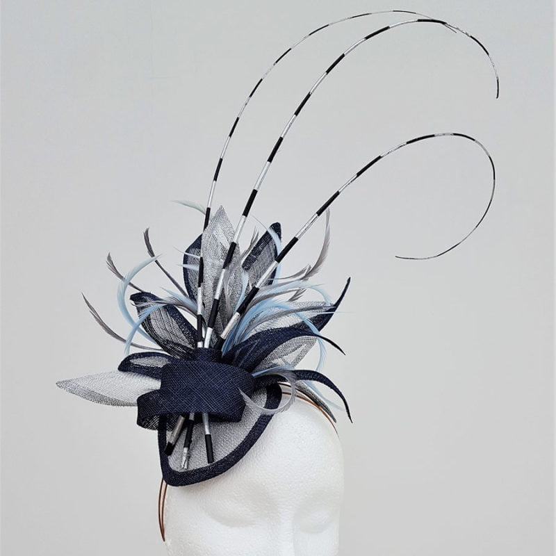 Striking fascinator in navy and silver sinamay. A trio of silver and navy curled ostrich quills burst from a cluster of sinamay petals with curled goose biot. A dramatic piece, very easy to wear. Sits on a headband.