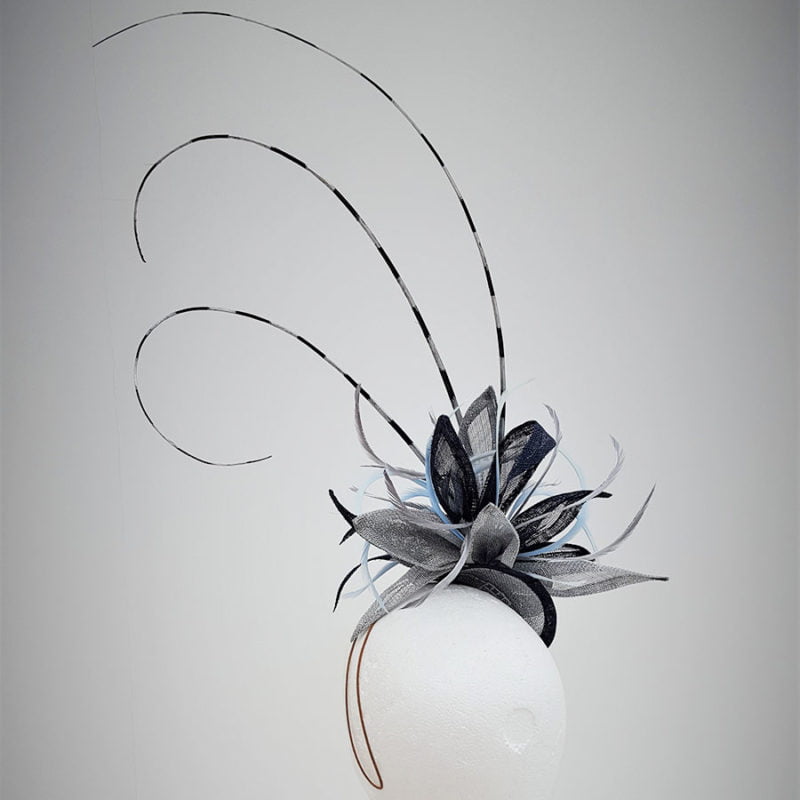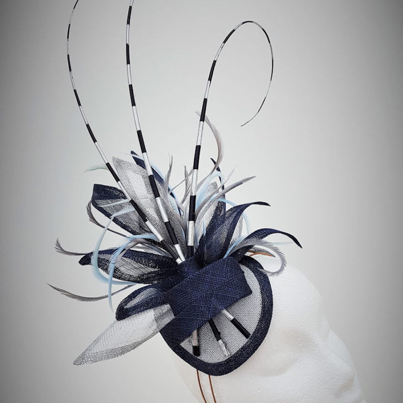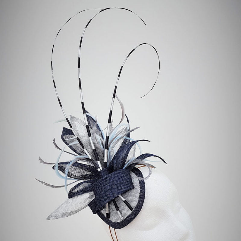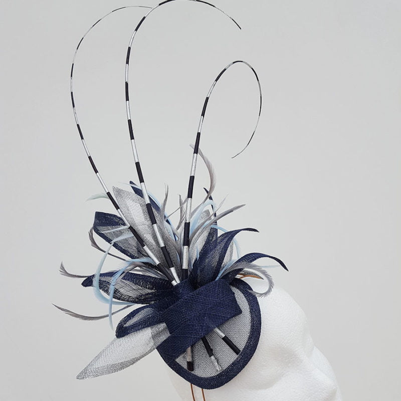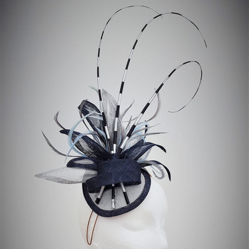 Striking fascinator in navy and silver sinamay. A trio of silver and navy curled ostrich quills burst from a cluster of sinamay petals with curled goose biot. A dramatic piece, very easy to wear. Sits on a headband.