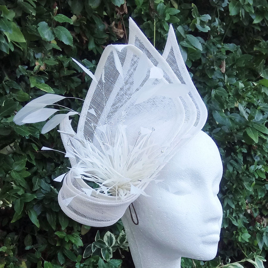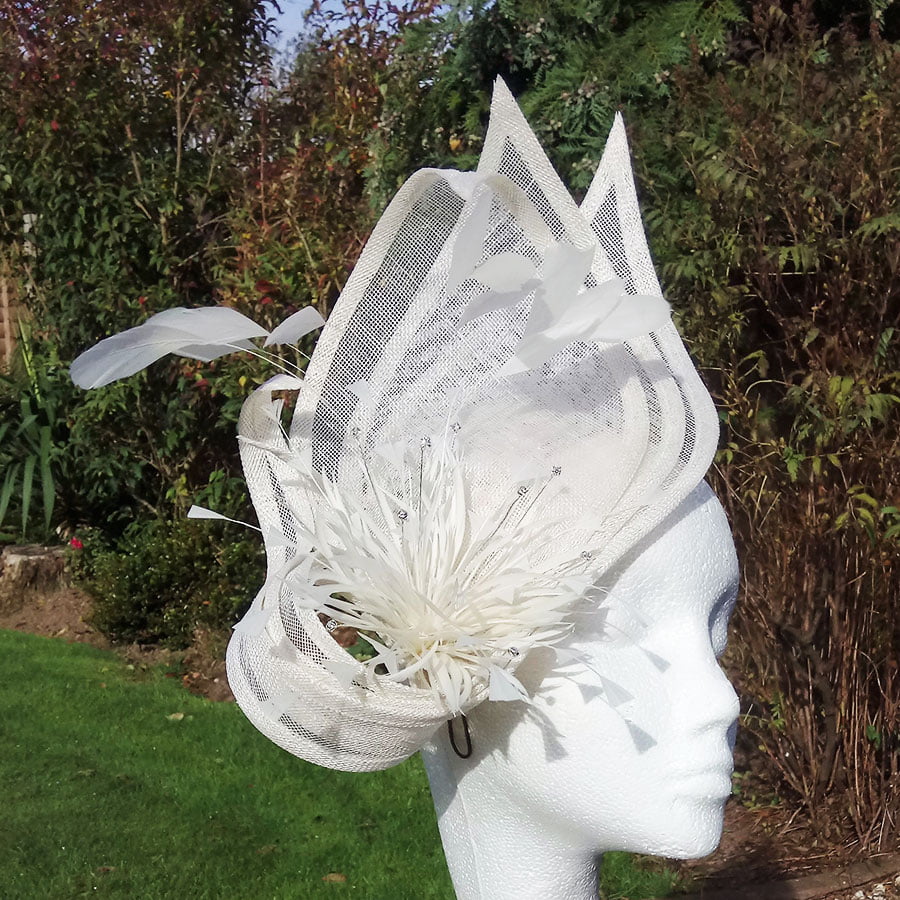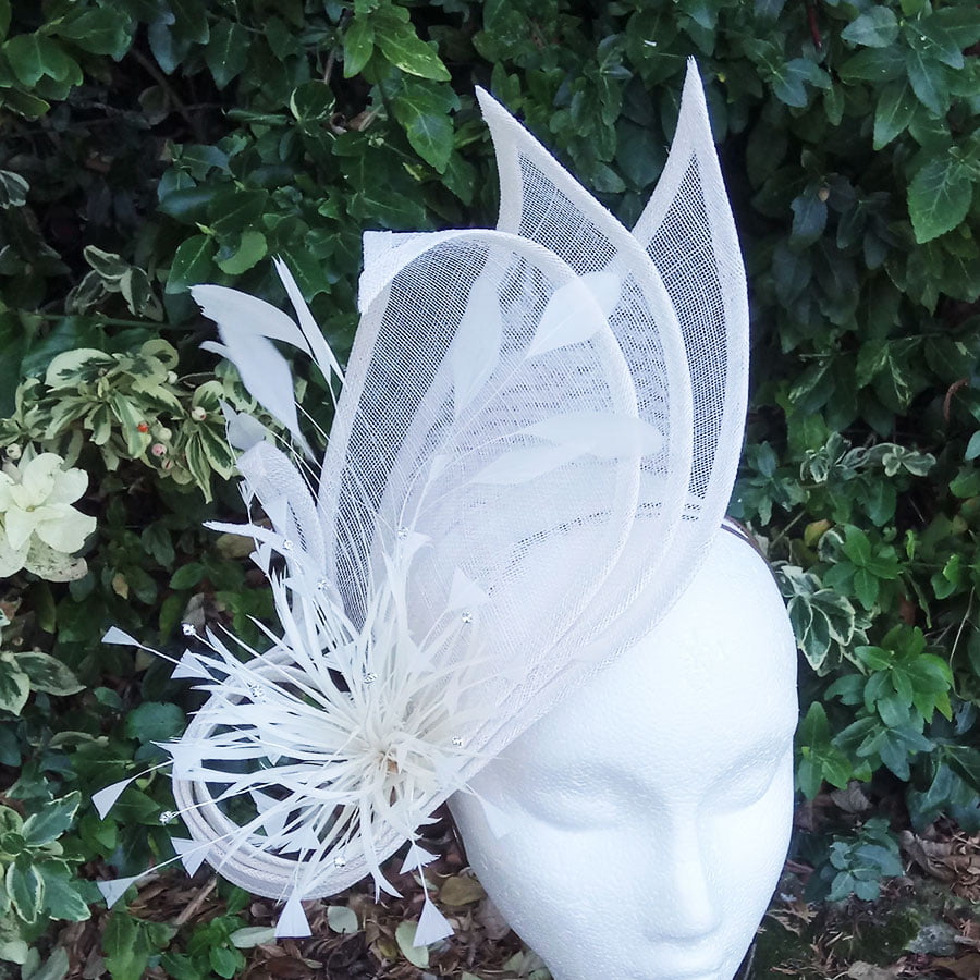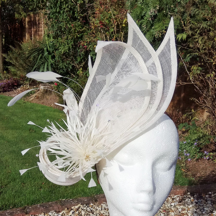 Stunning hatinator in ivory sinamay. 3 large petals create a striking fan effect whilst the elongated stems curl around double starburst flowers which have been adorned with faux diamonds, shooting like a firework.. A cluster of coq feathers sway in the breeze as they gently follow the curve of the petals. Simply beautiful. Sits on a headband.