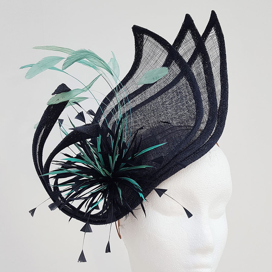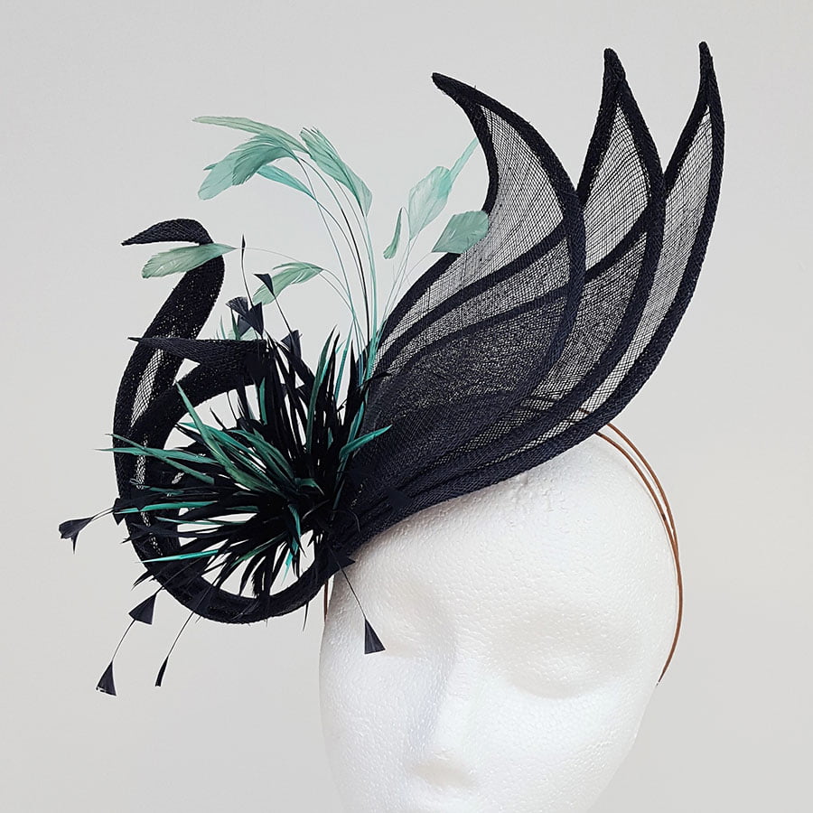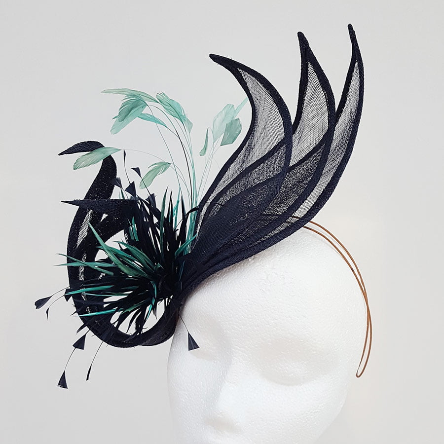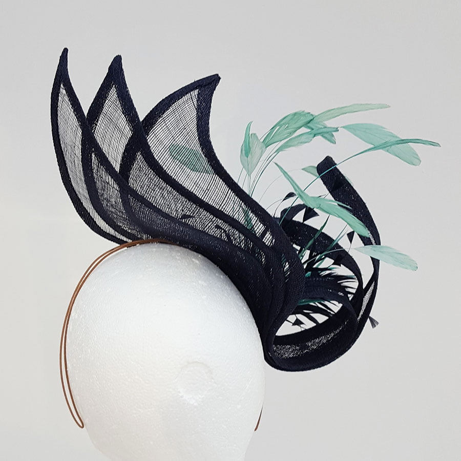 Stunning hatinator in navy sinamay. 3 large petals create a striking fan effect whilst the elongated stems curl around a starburst flower which has been adorned with contrasting sea green goose biot. A cluster of coq feathers sway in the breeze as they gently follow the curve of the petals. Simply beautiful. Sits on a headband.