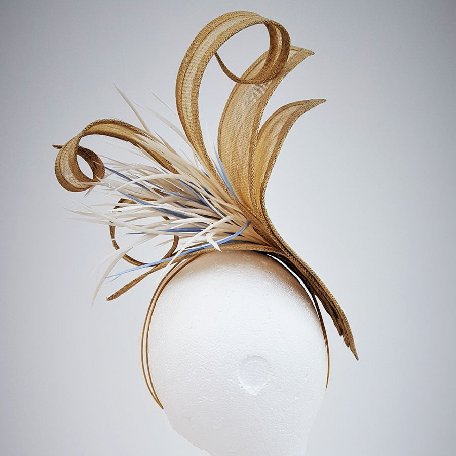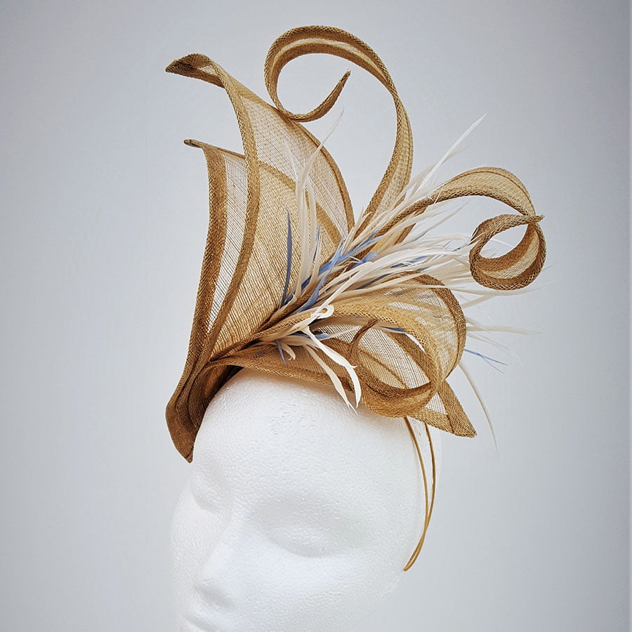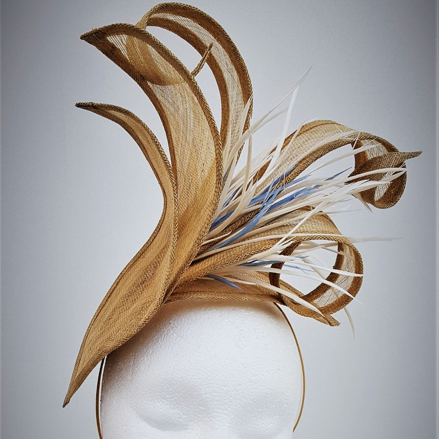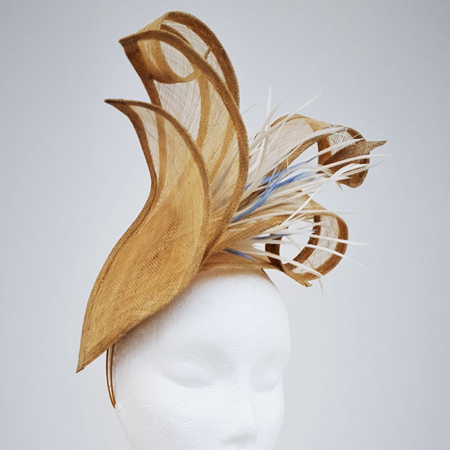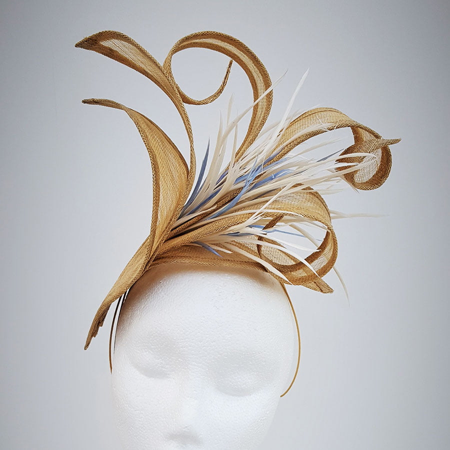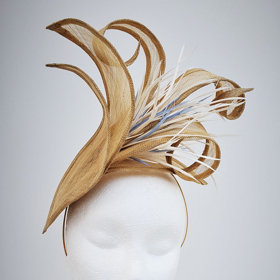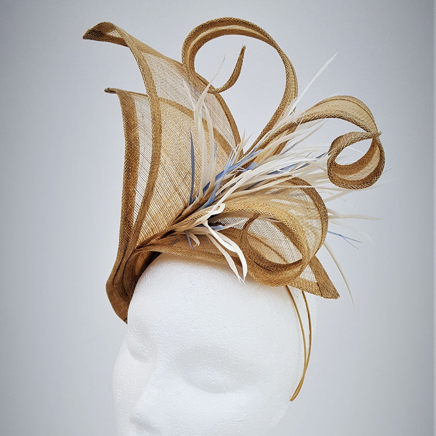 Stunning hatinator in vintage gold sinamay. Large petals create a striking effect whilst the elongated petals curl and twist to create a beautiful shape. A cluster of ivory goose biot with hints on wedgwood blue, create movement on this simply elegant headpiece. Sits on a headband.