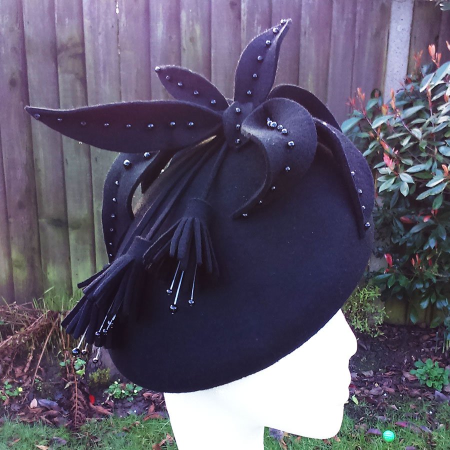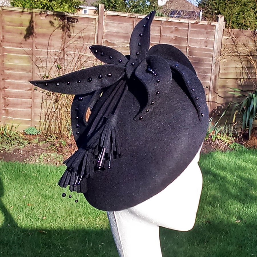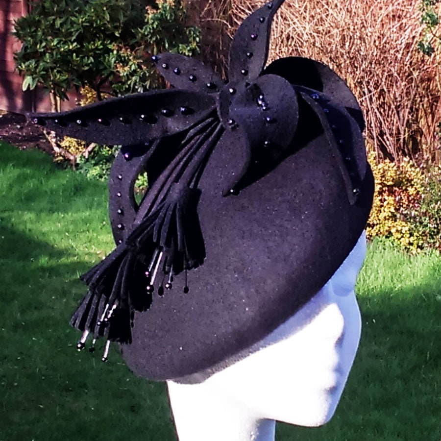 Wool Felt Beret embellished with matching petals – each petal adorned with black pearls. Three pom pom tassles create a cheeky look. Perfect for winter weddings and race meetings.