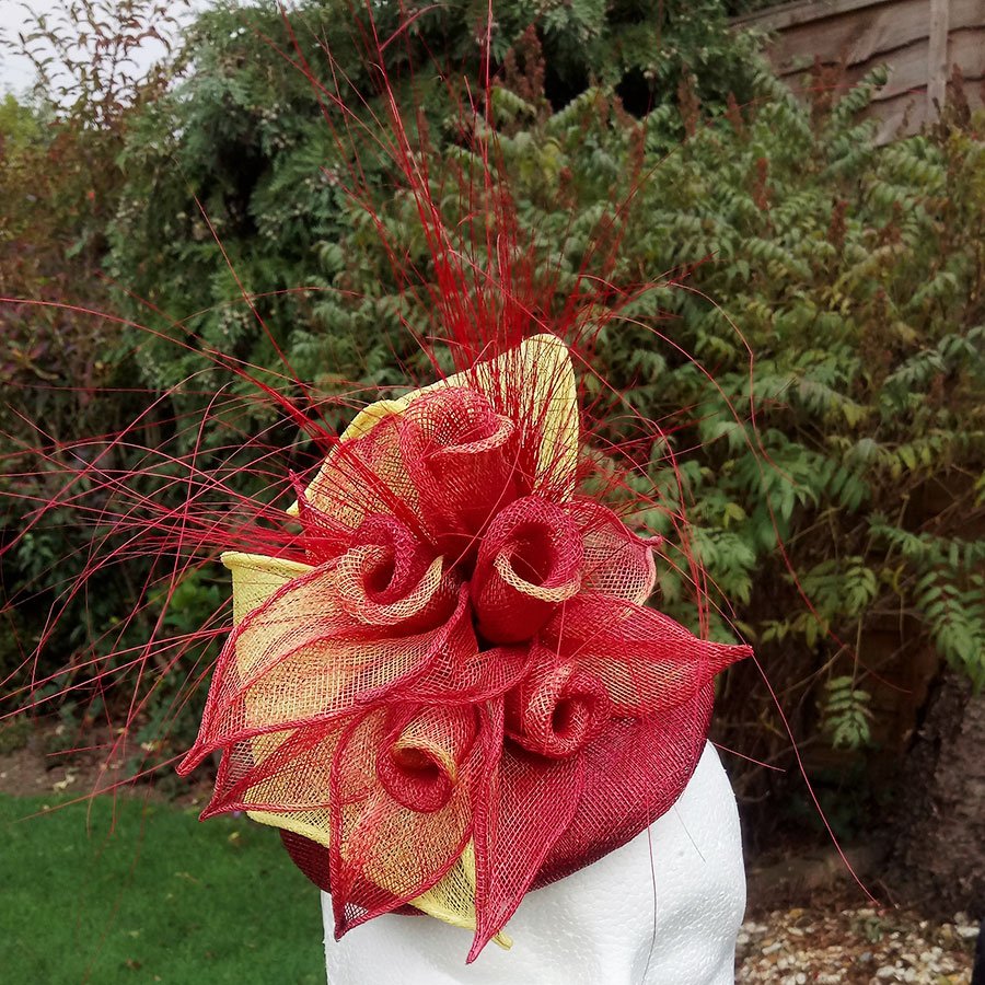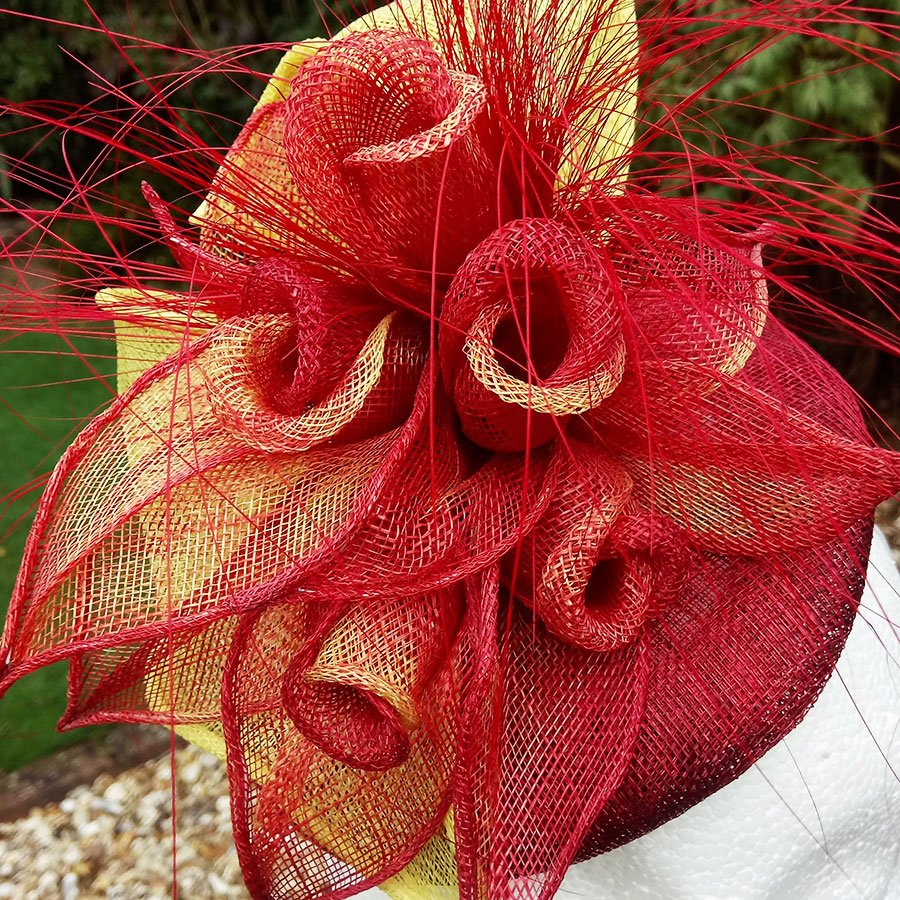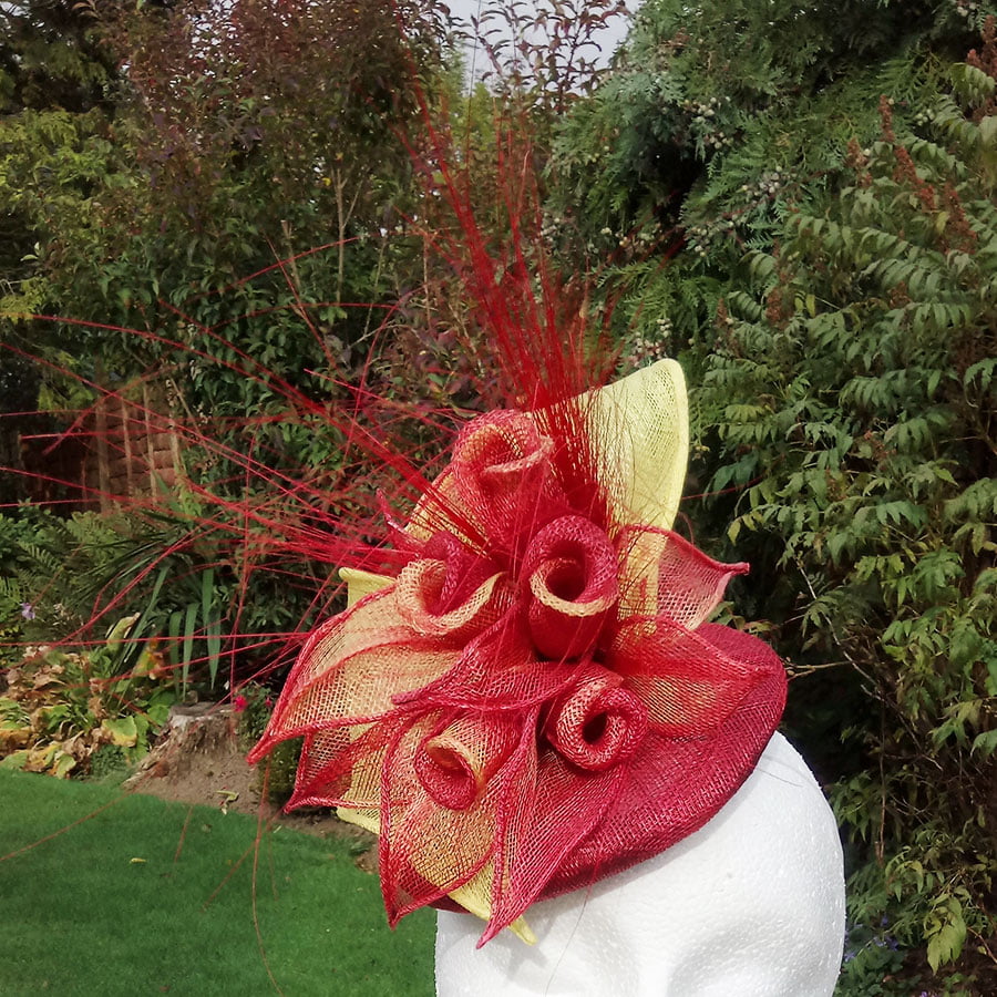 Stunning hand dyed sinamay headpiece. Hand dyed/made roses lovingly coiled in hand made rolled petals in burnt reds and yellows for a dramatic effect. Finished with burnt peacock brushmount.