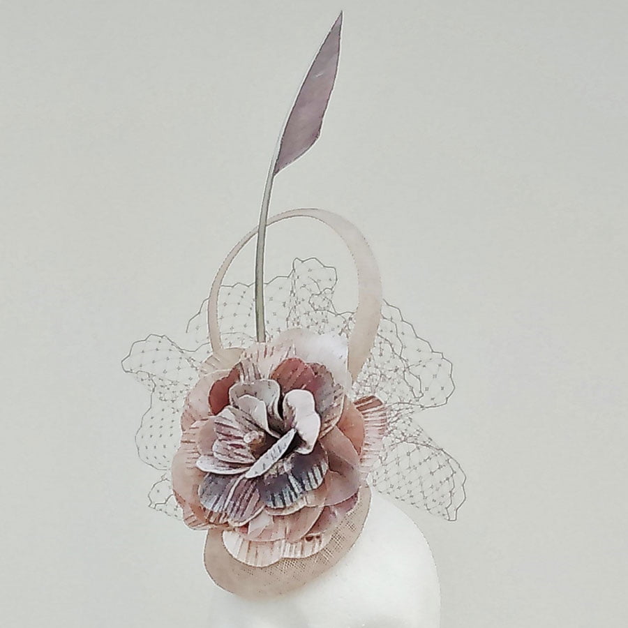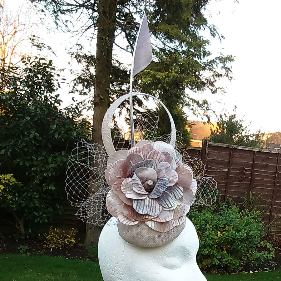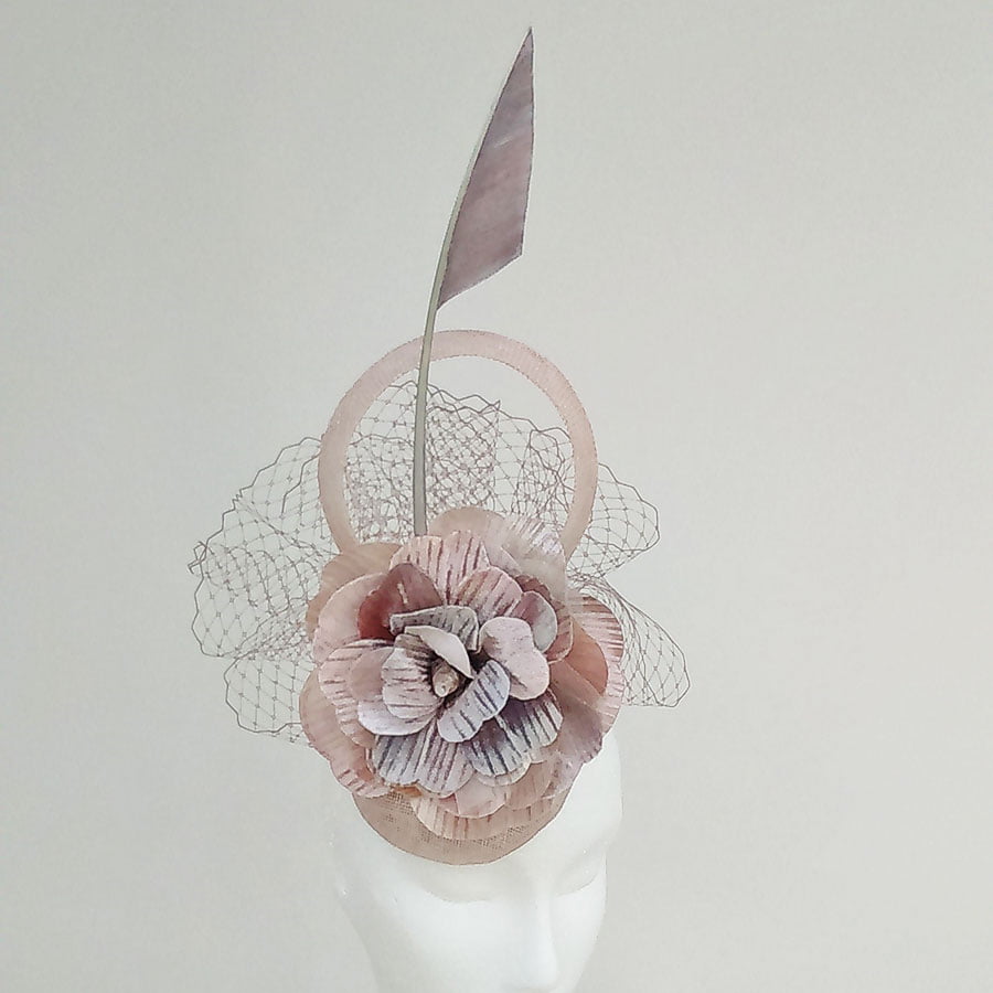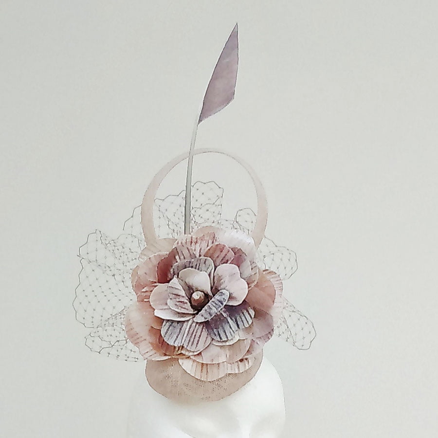 Hand painted embossed silk velvet flower and quill, created to give a Mother of Pearl effect shimmer. Soft colours of pinks, greys, blues and lilacs, combined with matching veiling create a stunning effect.